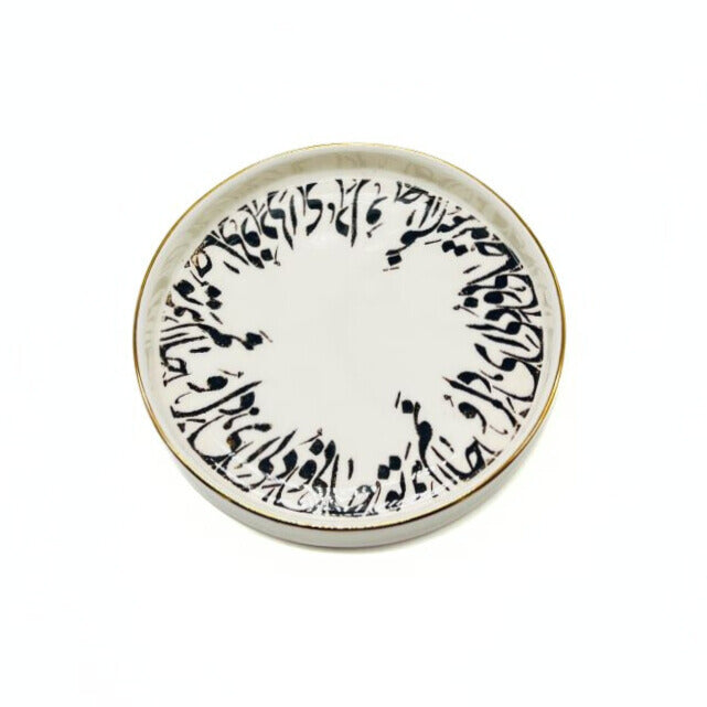 A beautifully handcrafted ceramic dish decorated with 11k gold calligraphy, showcasing the elegance of Persian artistry. Its flat design makes it both functional and decorative — perfect for elevating your table or display.