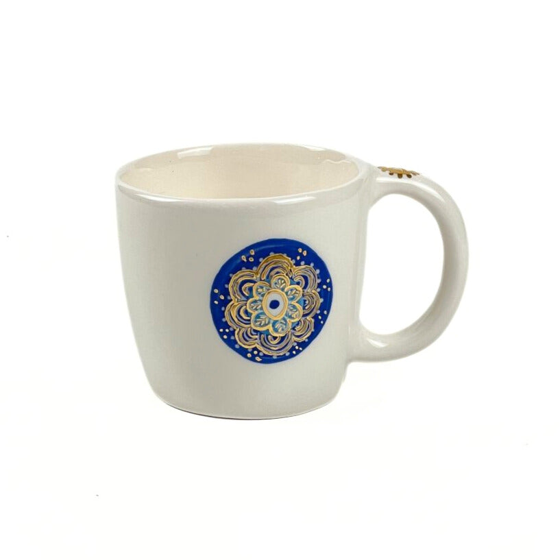 A beautifully handcrafted ceramic mug decorated with 11k gold and featuring the symbolic Evil Eye (Nazar) design. Known as a talisman of protection, good luck, and positive energy, this mug blends everyday functionality with timeless cultural meaning.