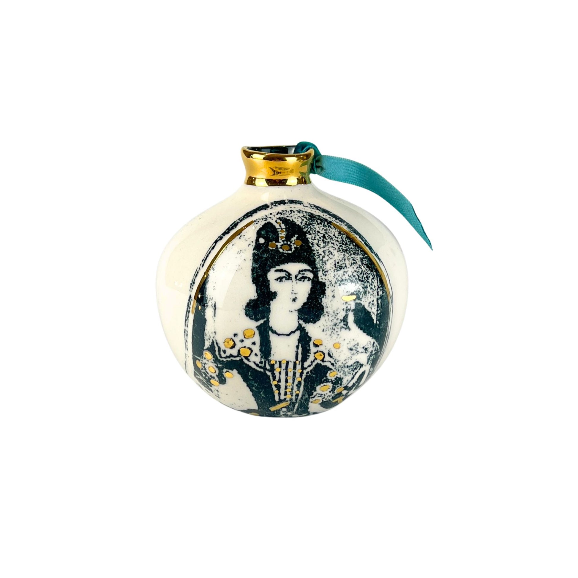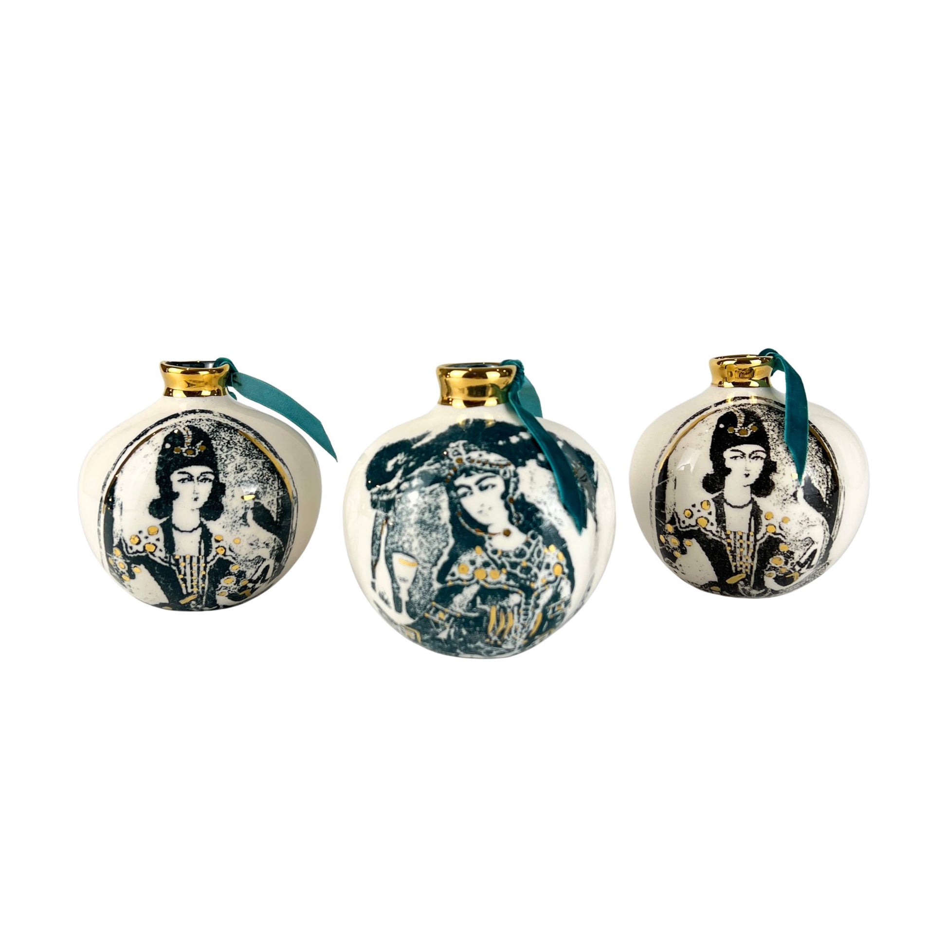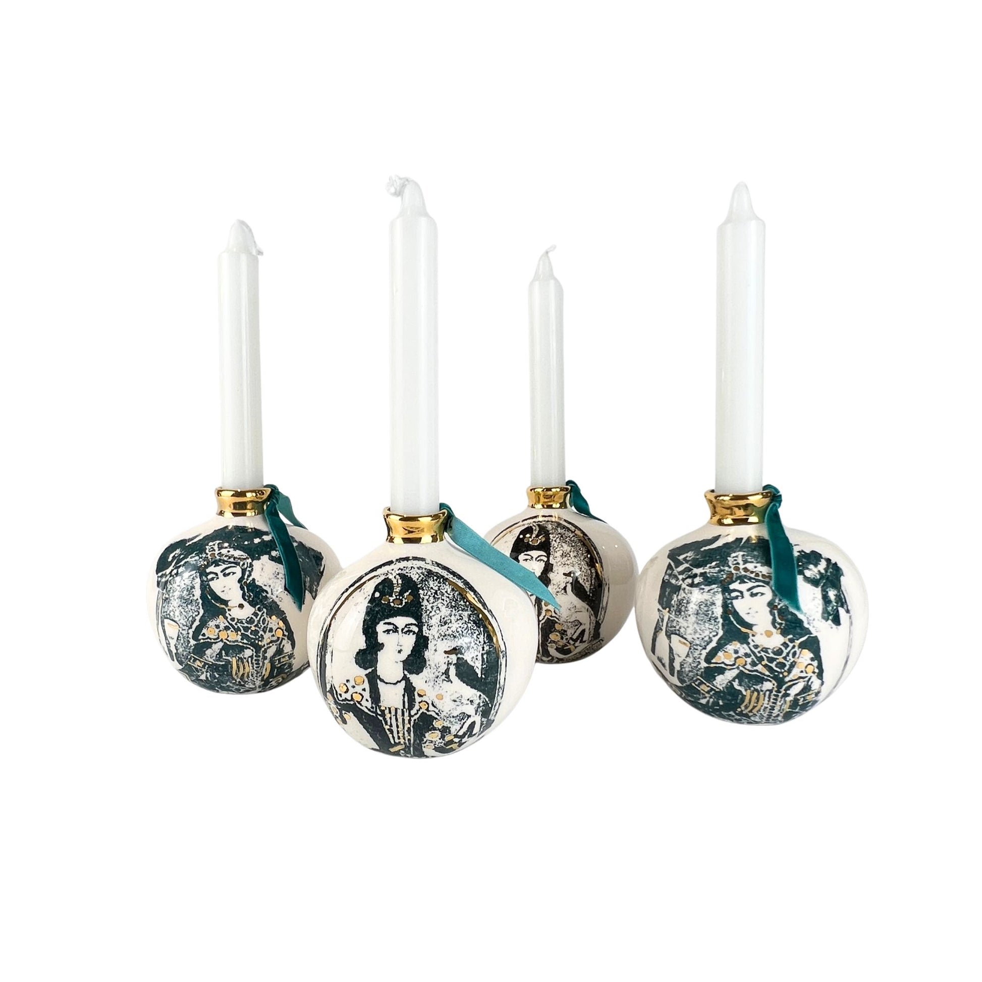Handcrafted pomegranate-shaped candle holders inspired by the elegance of Qajar-era portrait art. Each piece features a detailed miniature-style illustration accented with touches of 11k gold, creating a beautiful fusion of history and modern craftsmanship.