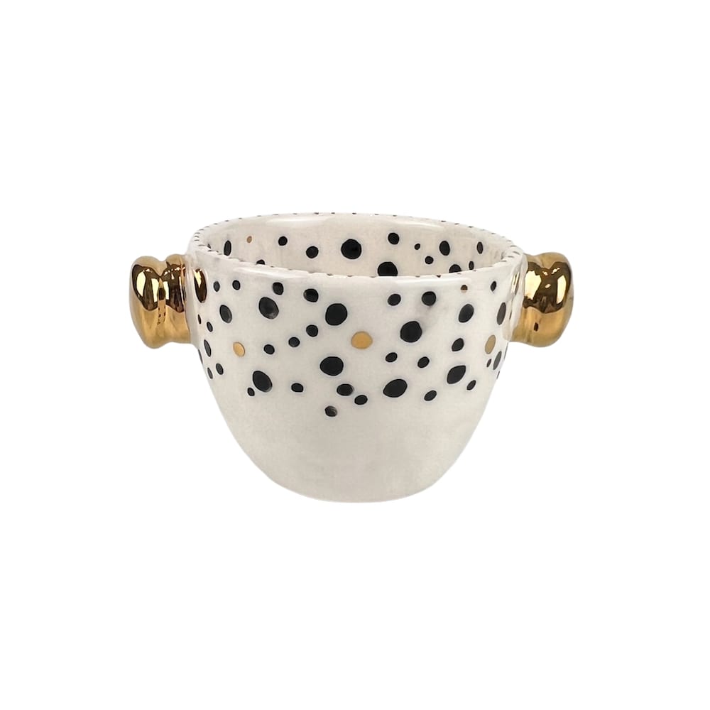 Handcrafted with care, this charming ceramic bowl features a playful mix of black and gold polka dots paired with elegant gold handles. Perfect for serving desserts, sweets, or small treats, it also makes a beautiful decorative accent for any table or space.