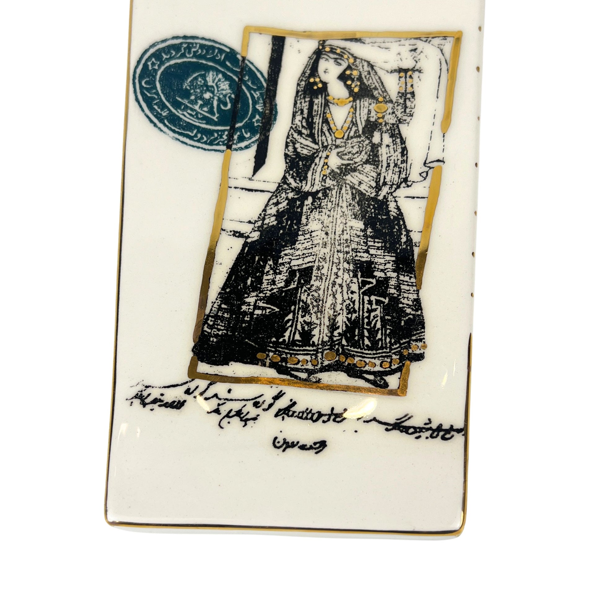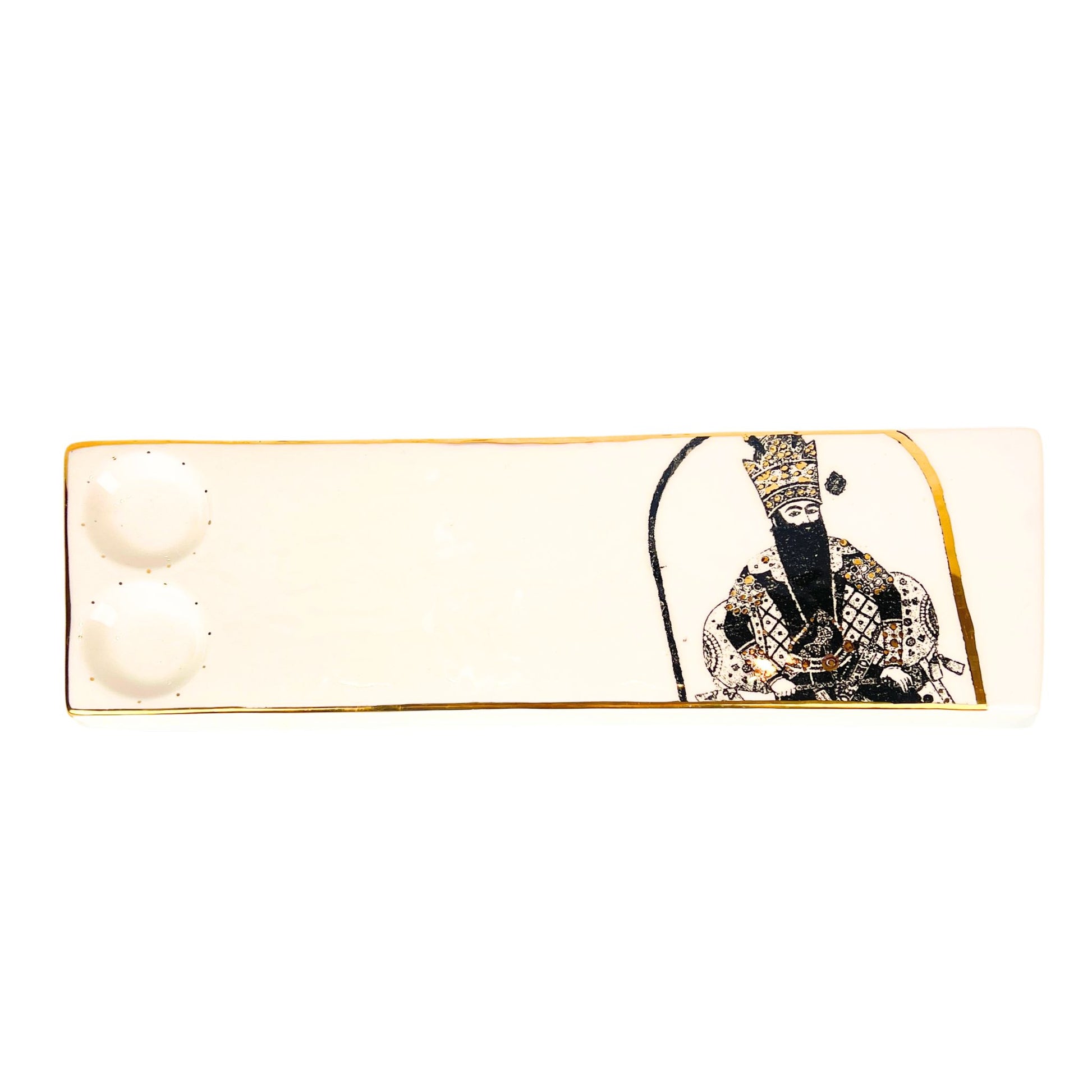 A handcrafted ceramic tray inspired by Persian art and the grandeur of the Qajar era. Featuring a detailed black-and-white portrait of a Qajar royal figure, this elongated tray is accented with a hand-applied gold rim for a refined, timeless finish. Designed with two integrated indentations for chai glasses, it is both functional and decorative — perfect for tea service, small treats, or as a statement piece on your table.