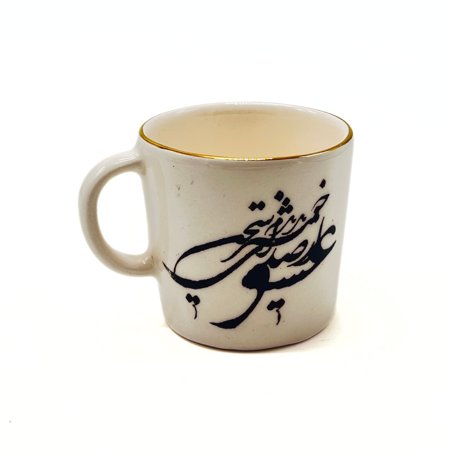 A handcrafted ceramic mug decorated with 11k gold calligraphy, featuring the poetic inscription Sedaye Sokhane Eshgh (صدای سخن عشق), meaning “The Voice of Love’s Words.” Blending elegance with cultural depth, this mug is perfect for enjoying your favorite drink while embracing the beauty of Persian poetry.