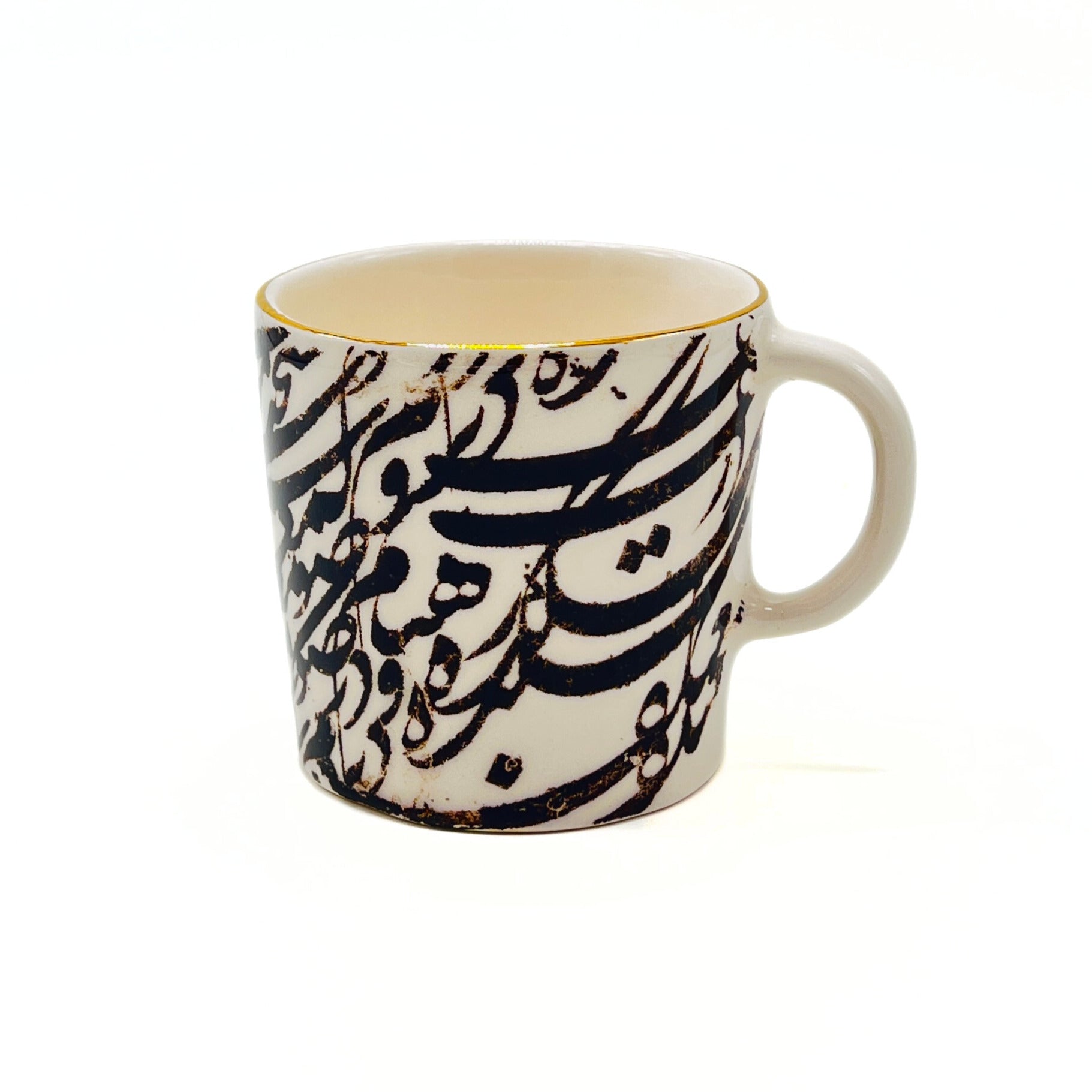 A handcrafted ceramic mug decorated with 11k gold calligraphy in the artistic style of Siyah Mashgh (Persian “black script” calligraphy). Elegant and functional, it’s perfect for enjoying your favorite hot or cold beverages while appreciating timeless artistry.