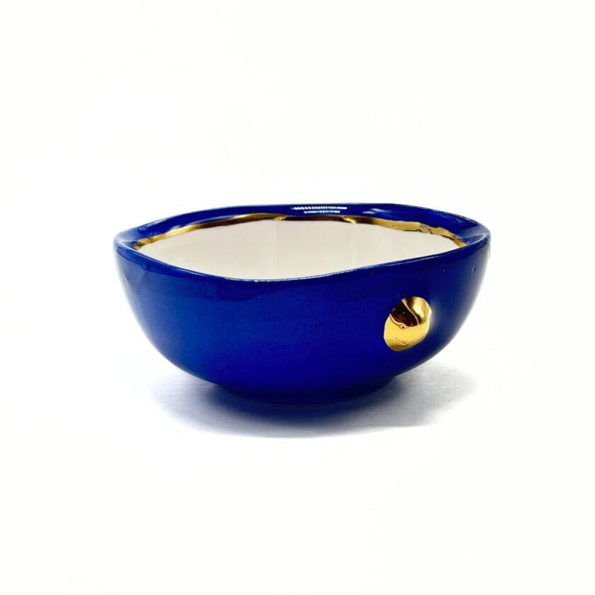 A handcrafted ceramic bowl in a deep blue glaze, elegantly decorated with 11k gold for a luxurious finish. Its square form offers a modern twist on traditional design, making it both functional and decorative.