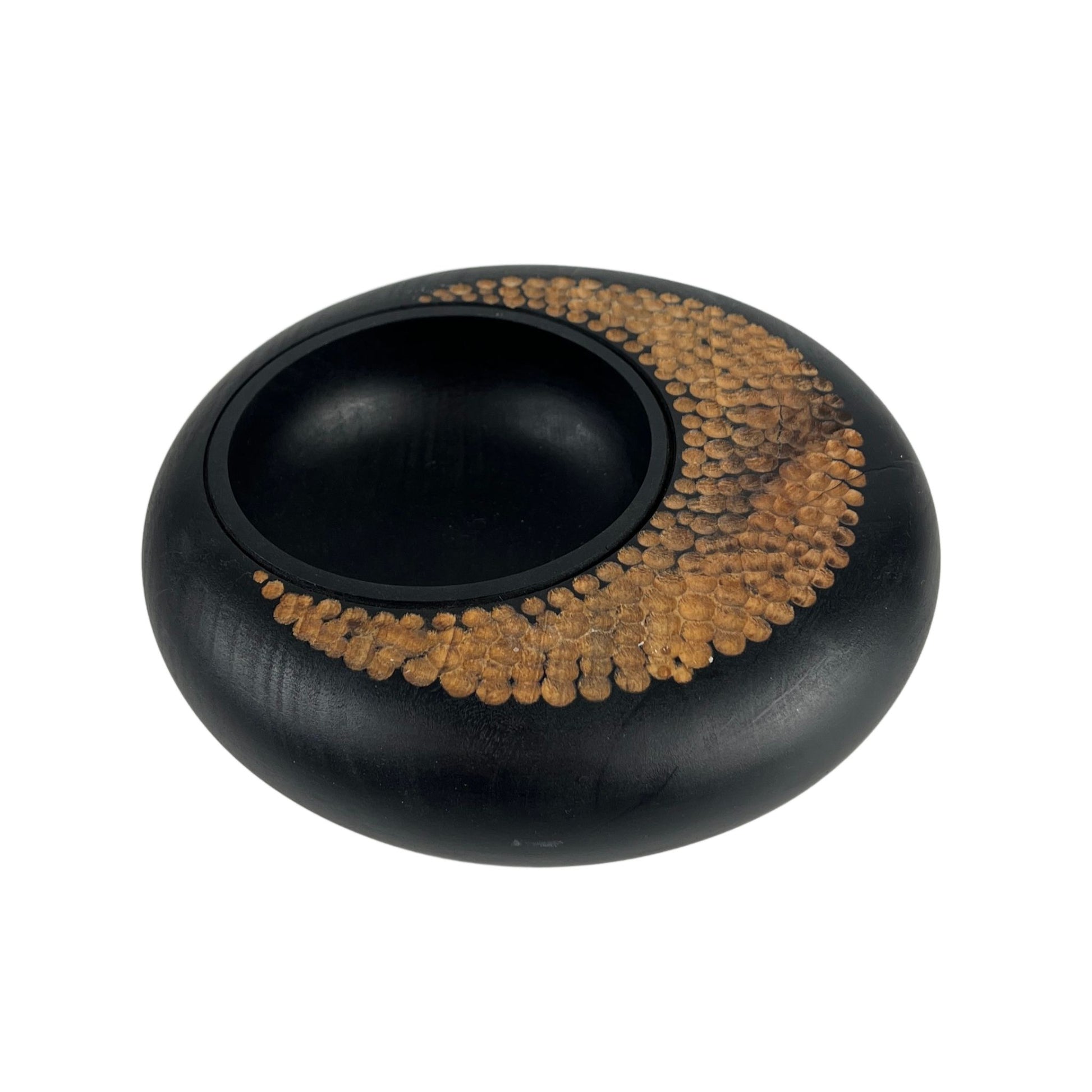 A handcrafted decorative dish made from alder wood and designed with a striking tooska (boxwood) inlay that radiates from the center like stylized feathers or sun rays. Both functional and artistic, it adds a bold natural accent to any home.
